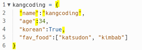 - Dictionary 안에서 '=' (equal)은 → ':' (colon) 으로 변경하고 각각의 key 와 value를 쌍따옴표로 묶어주고, 1개의 key+value 셋트마다 ',' (comma) 를 써준다.